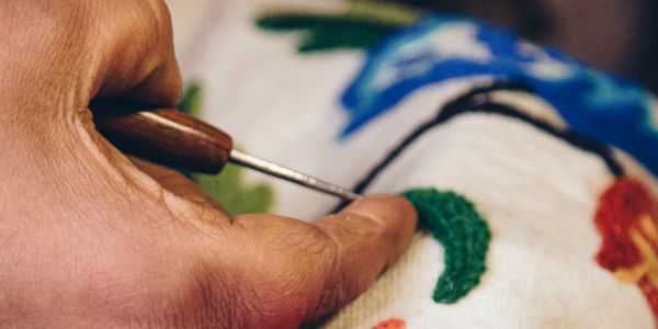 The intricate process of creating crewel or aari embroidery begins with artisans weaving their stitches carefully over the hand-traced design. While both techniques resemble chain stitch, they differ in materials, motifs, and texture. Traditionally, crewel embroidery is crafted on thicker fabrics such as wool (khaddar) using a hook-like needle and 2- or 3-ply woollen yarn, making it ideal for winter furnishings like curtains and bedding. Over time, this heritage technique has evolved; today, it is also practiced on velvet, organza, and cotton, bringing versatility and a modern sensibility to this age-old craft.