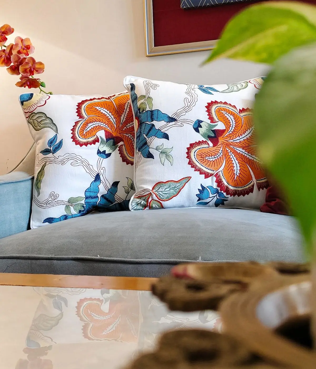 I love Hibiscus flowers and have many in my lawn. This cushion depicts it so well, hence placed it in my outdoor chair. Looks so elegant. Fabric is very durable yet premium.