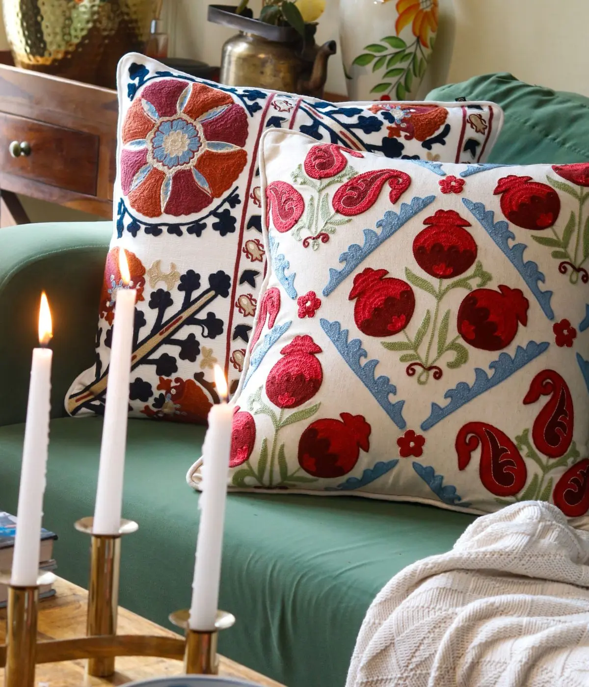 Design Story: Inspired by the vibrant pomegranate flower (Dainposh in Kashmiri), this cushion cover brings together rich shades of red and deep maroon, echoing the fruit’s natural palette. Intricately crafted with traditional Kashmiri aari embroidery, it’s a timeless piece that celebrates heritage and craftsmanship.